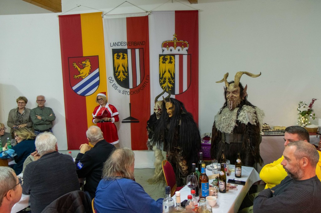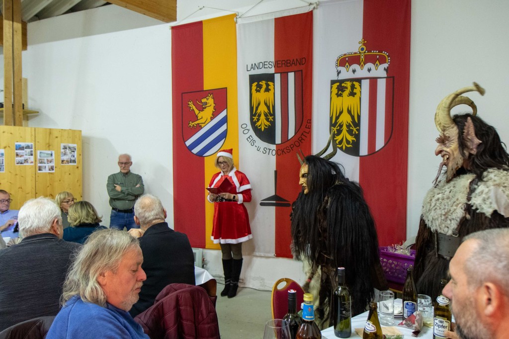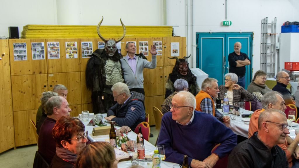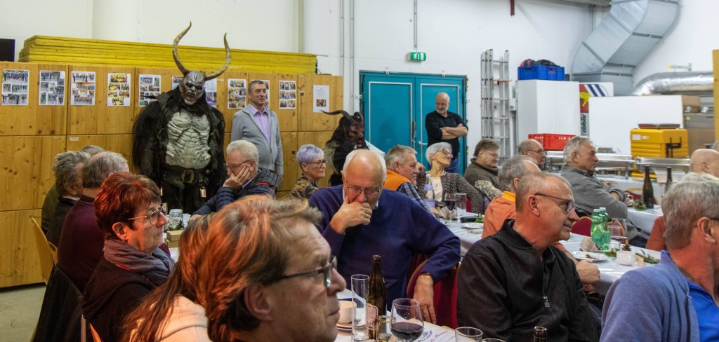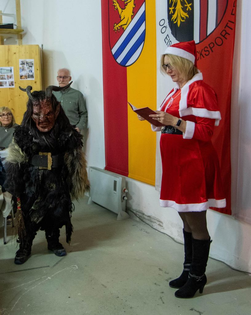 Nach einem gemütlichen Schmaus wurde uns dann von unserer Nikola (viele kennen sie auch unter Kati) ein Jahresrückblick gegeben. Diejenigen die brav waren, bekamen ein Geschenk und die nicht so braven, naja die bekamen dann von den Perchten die Rute 😉